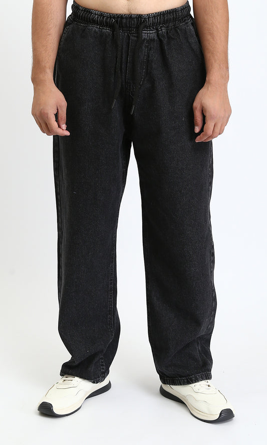 R208744 - Elastic Waist Wide Solid Denim Pants - Black