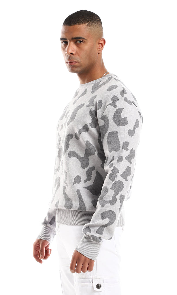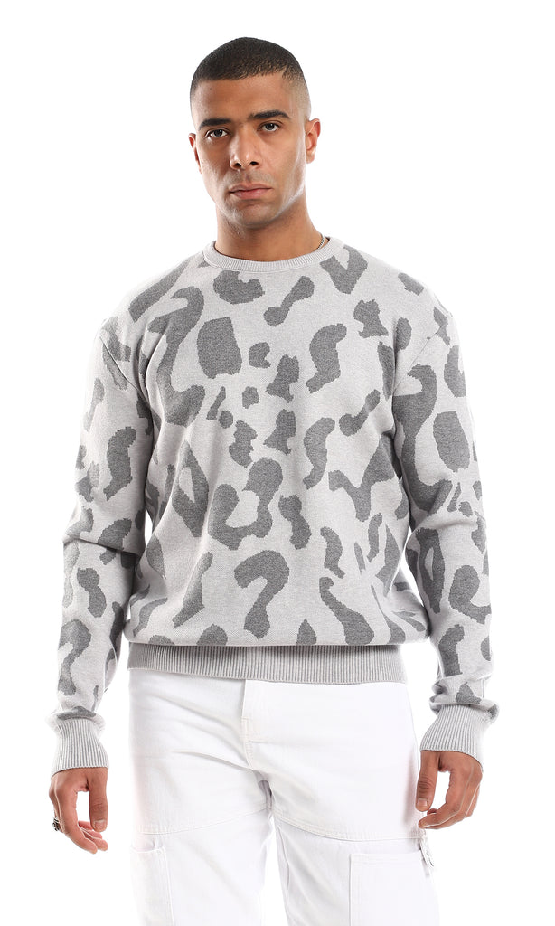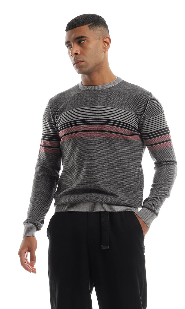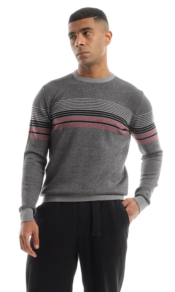 R212605 - Striped Round Neck Basic Pullover - Grey