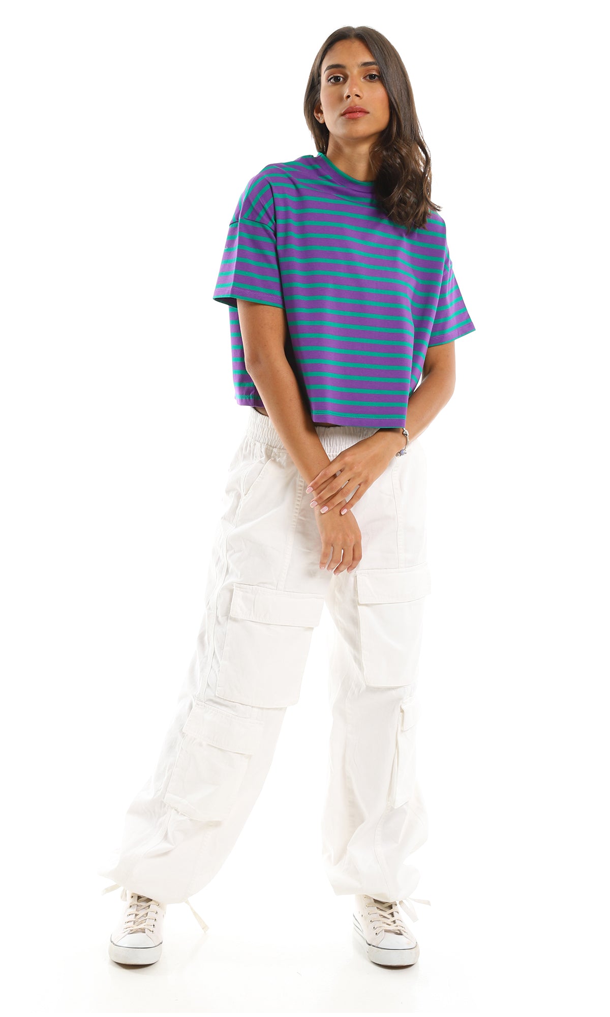 97653 Purple & Green Striped Short Sleeves Crew Neck T-Shirt