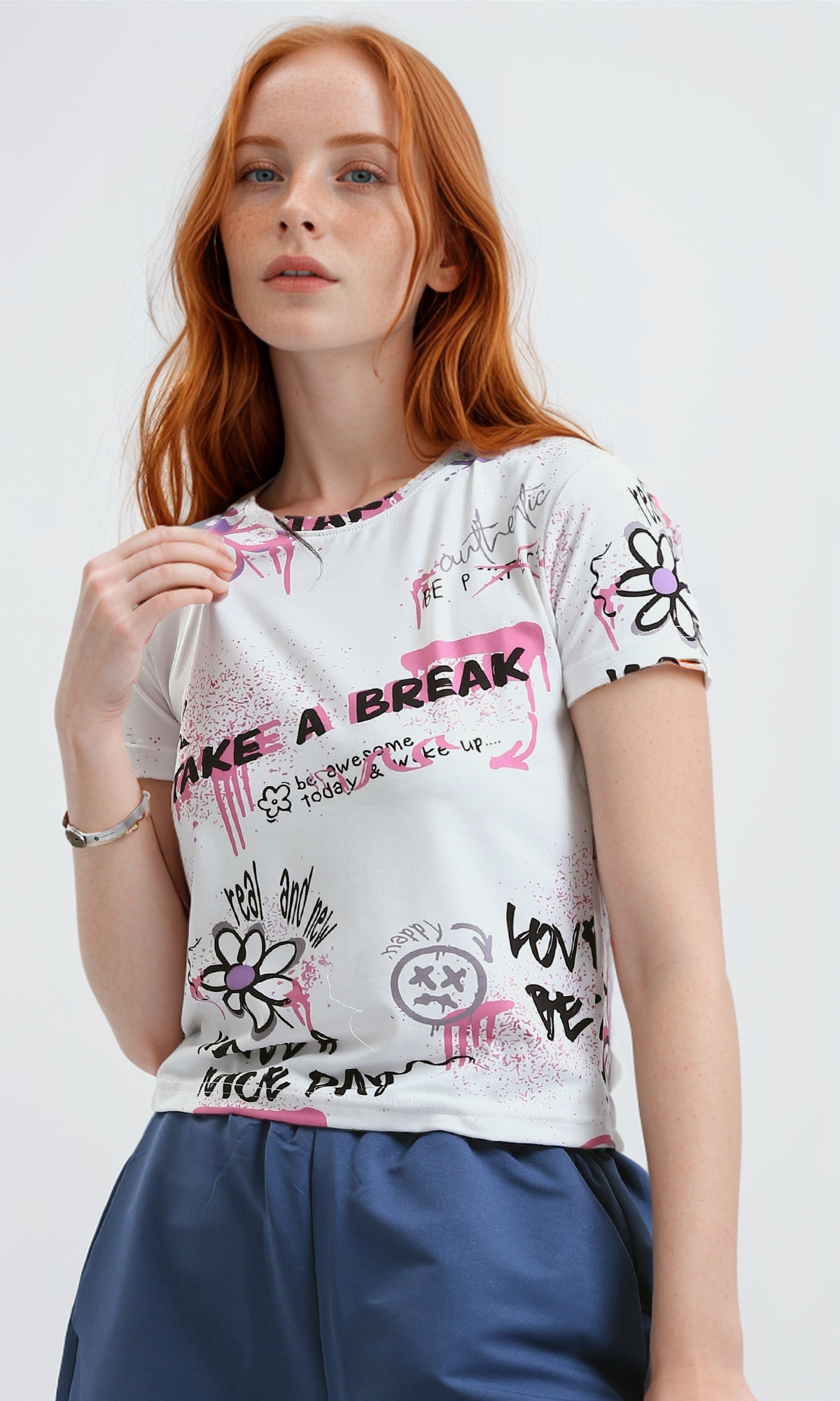 O182835 Colorful Flowers Crew Neck Summer Tee - Multicolour