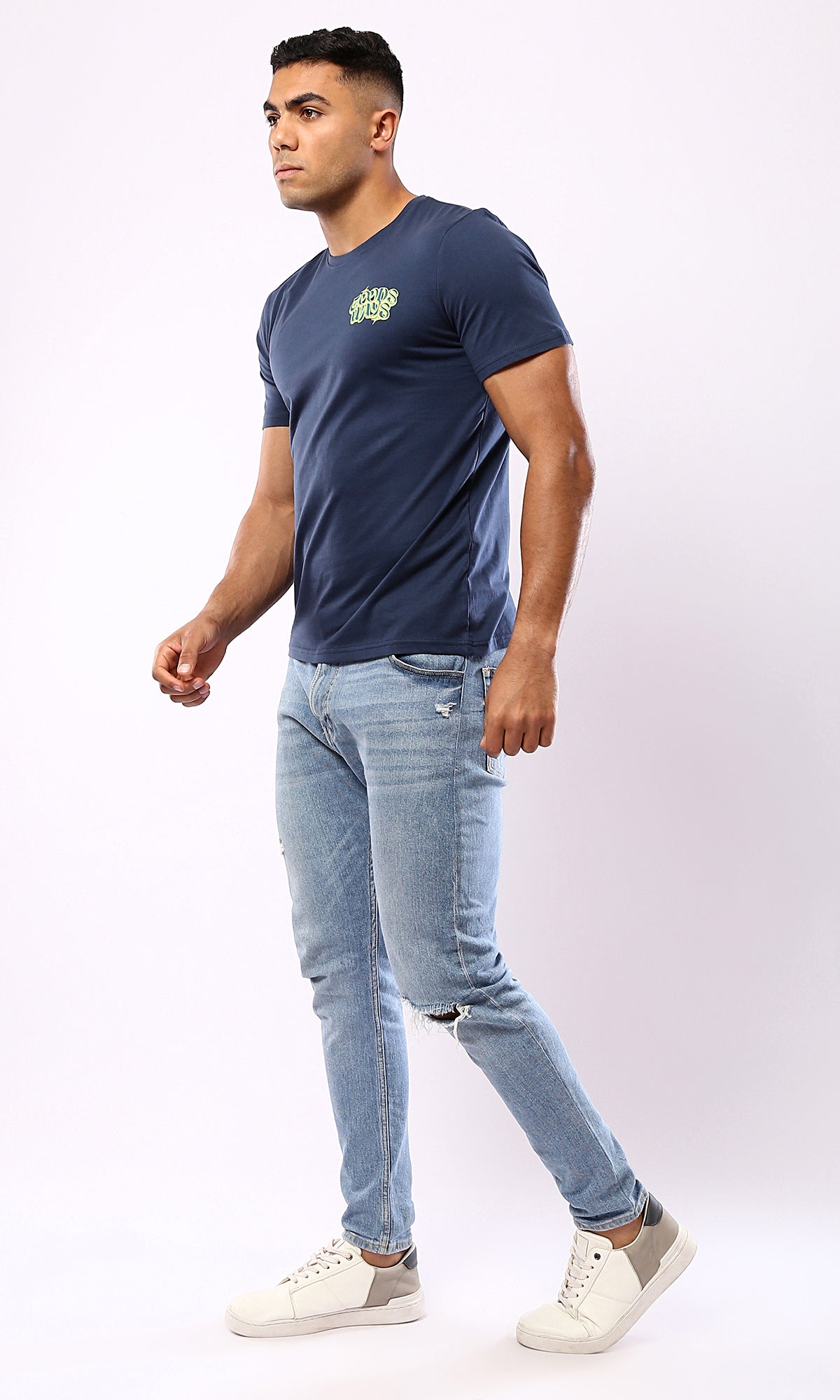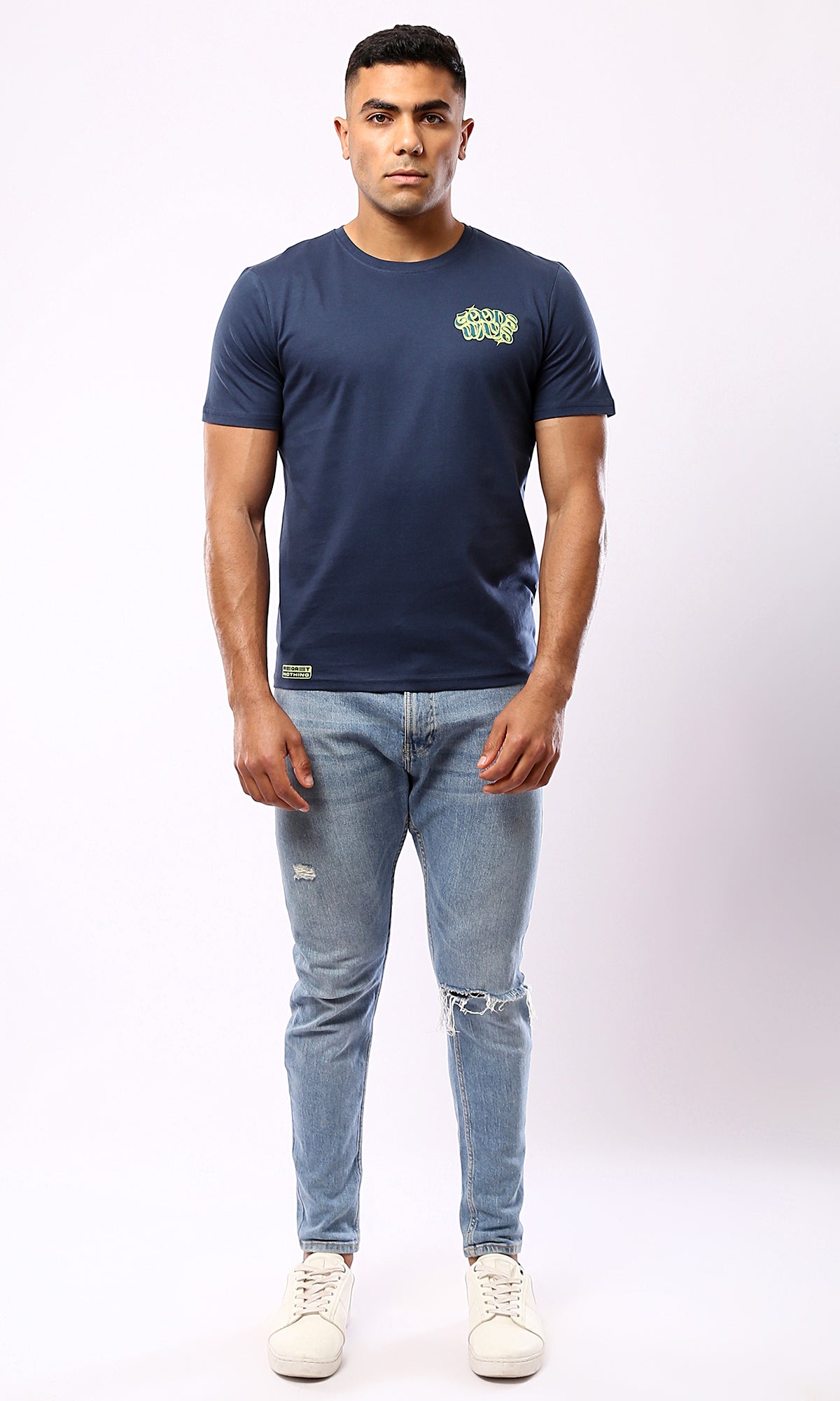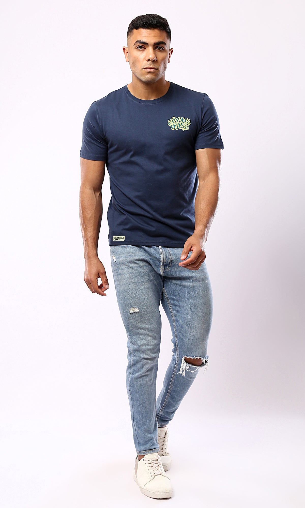 O182898 Printed "Goods Ways" Light Navy Blue Cotton Tee