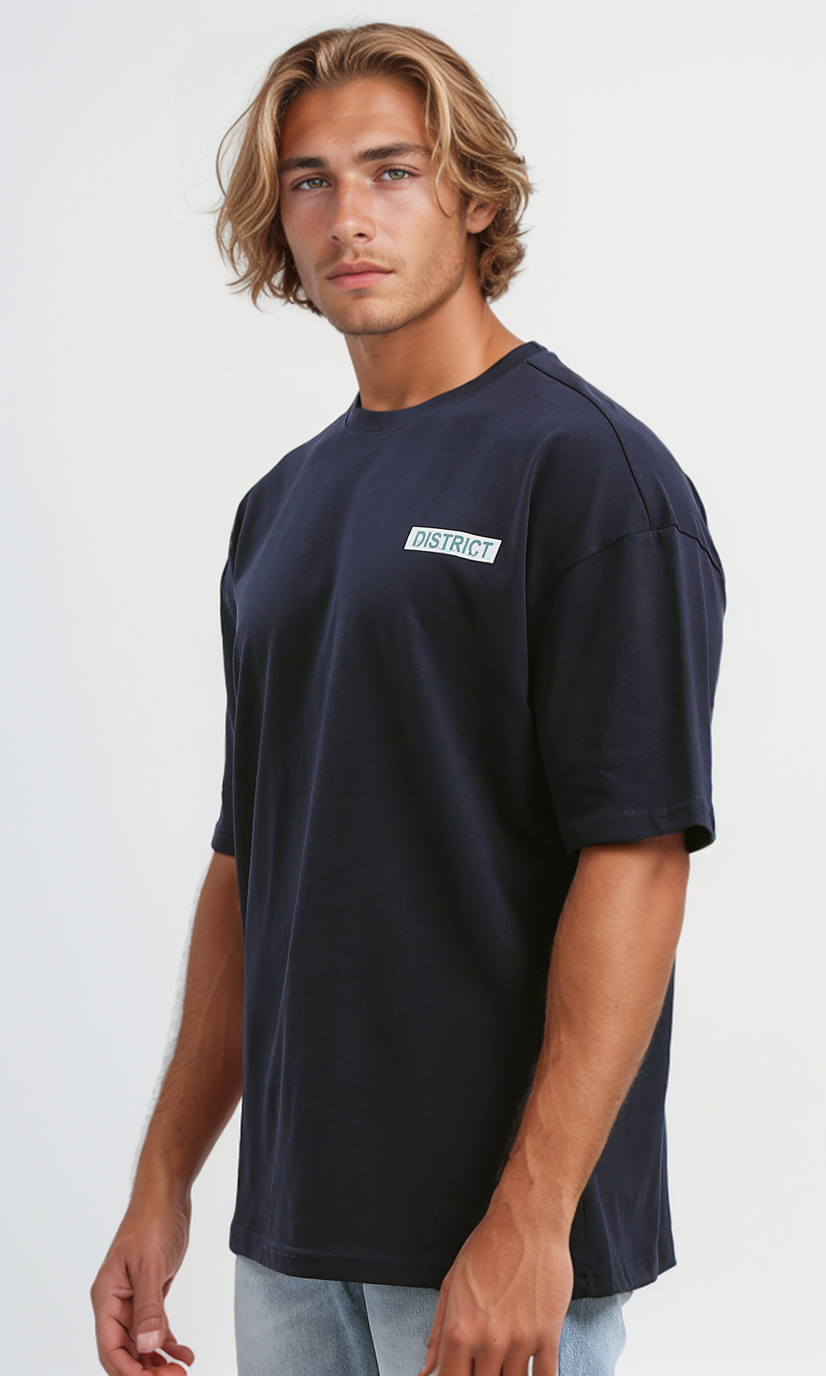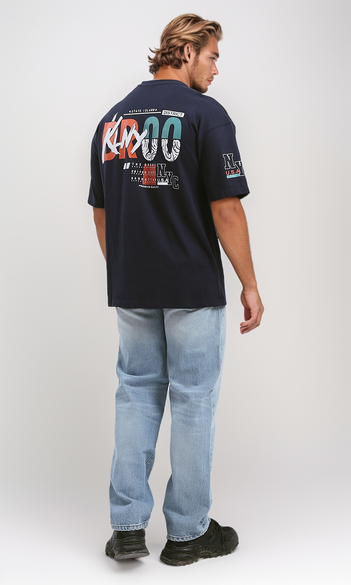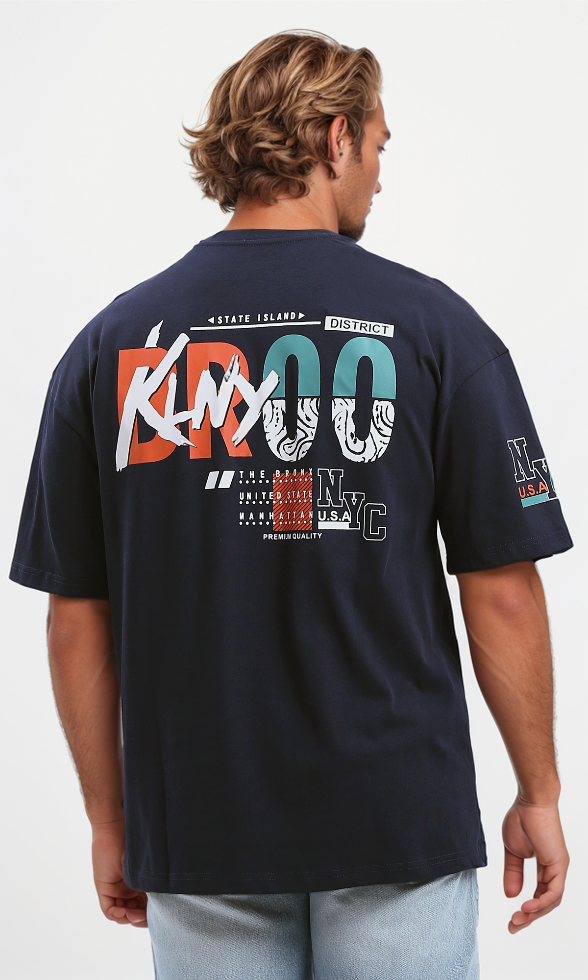 O182907 Navy Blue Casual Tee With Front & Back Print