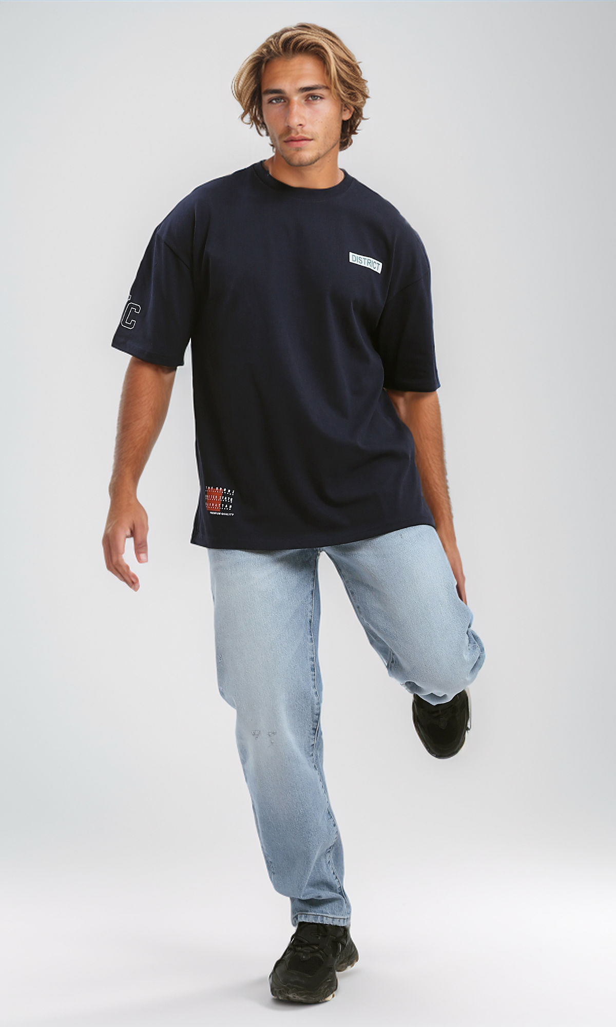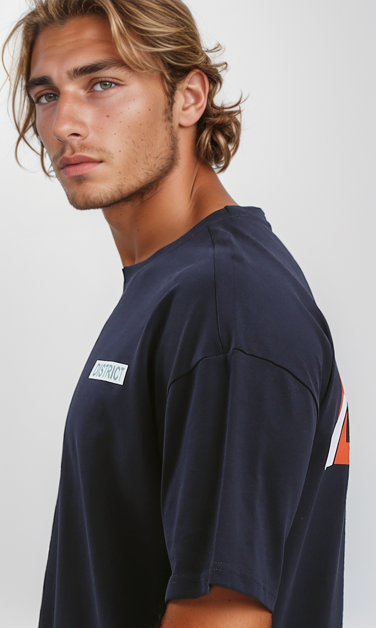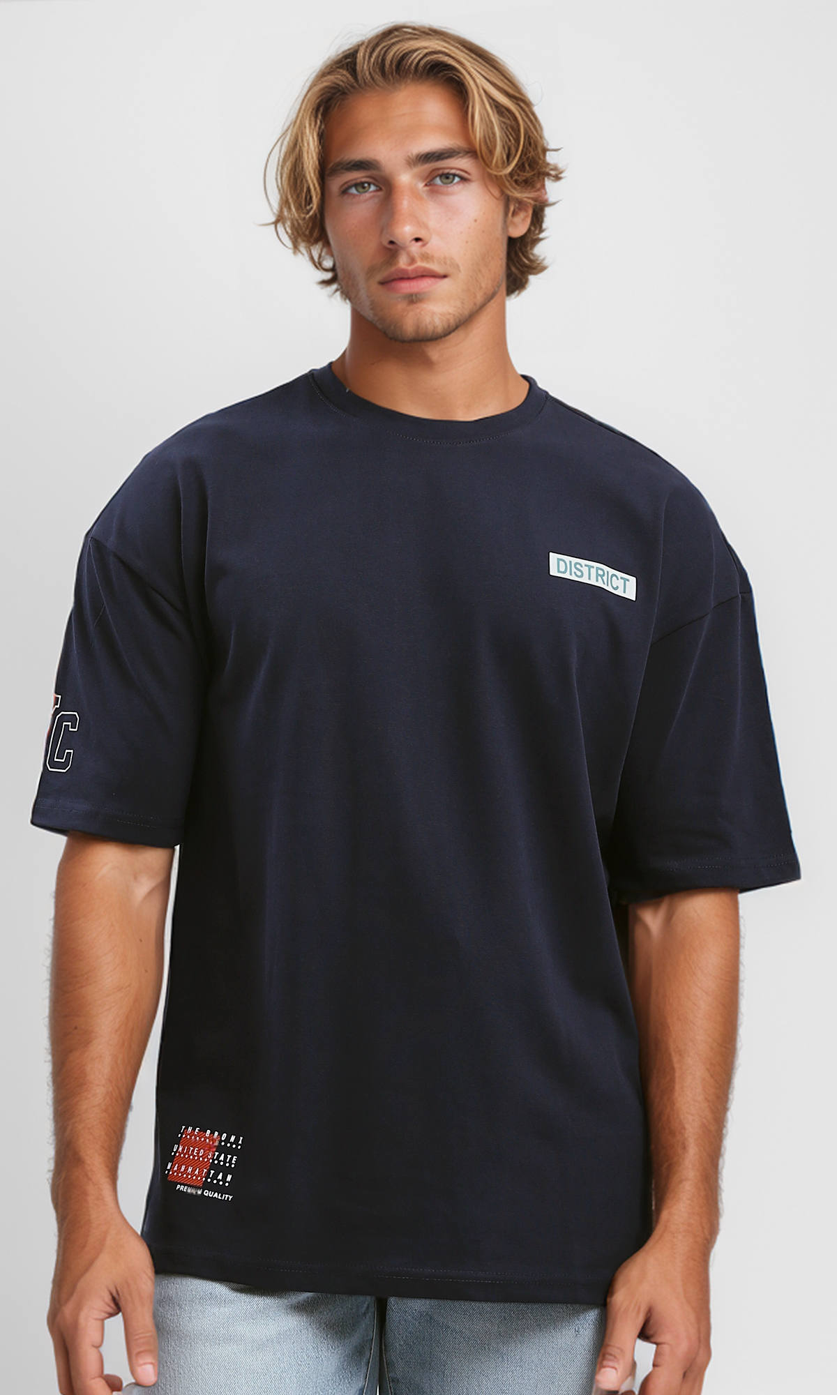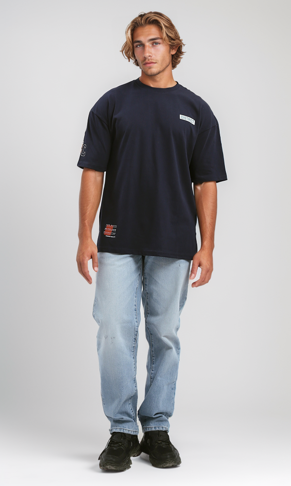 O182907 Navy Blue Casual Tee With Front & Back Print