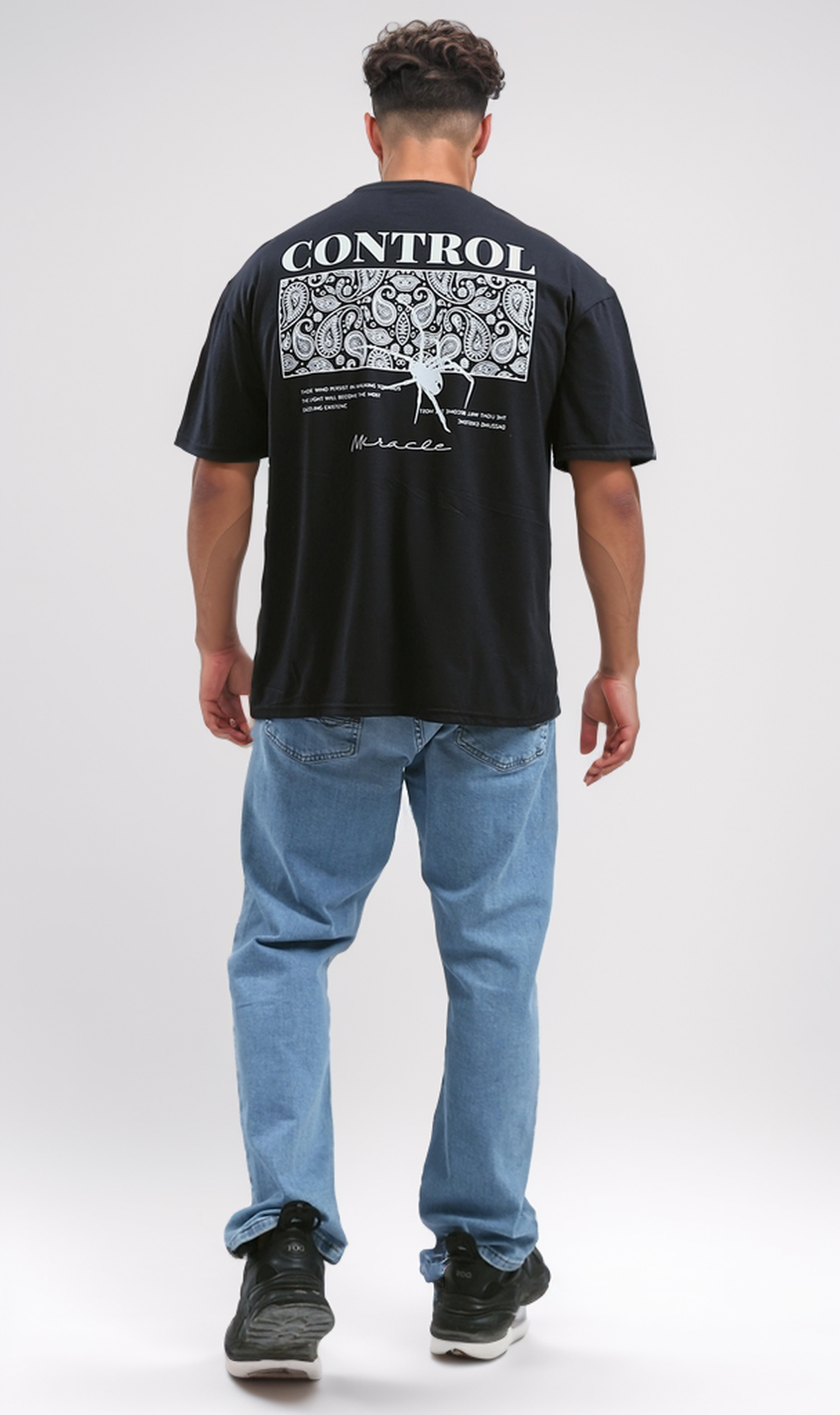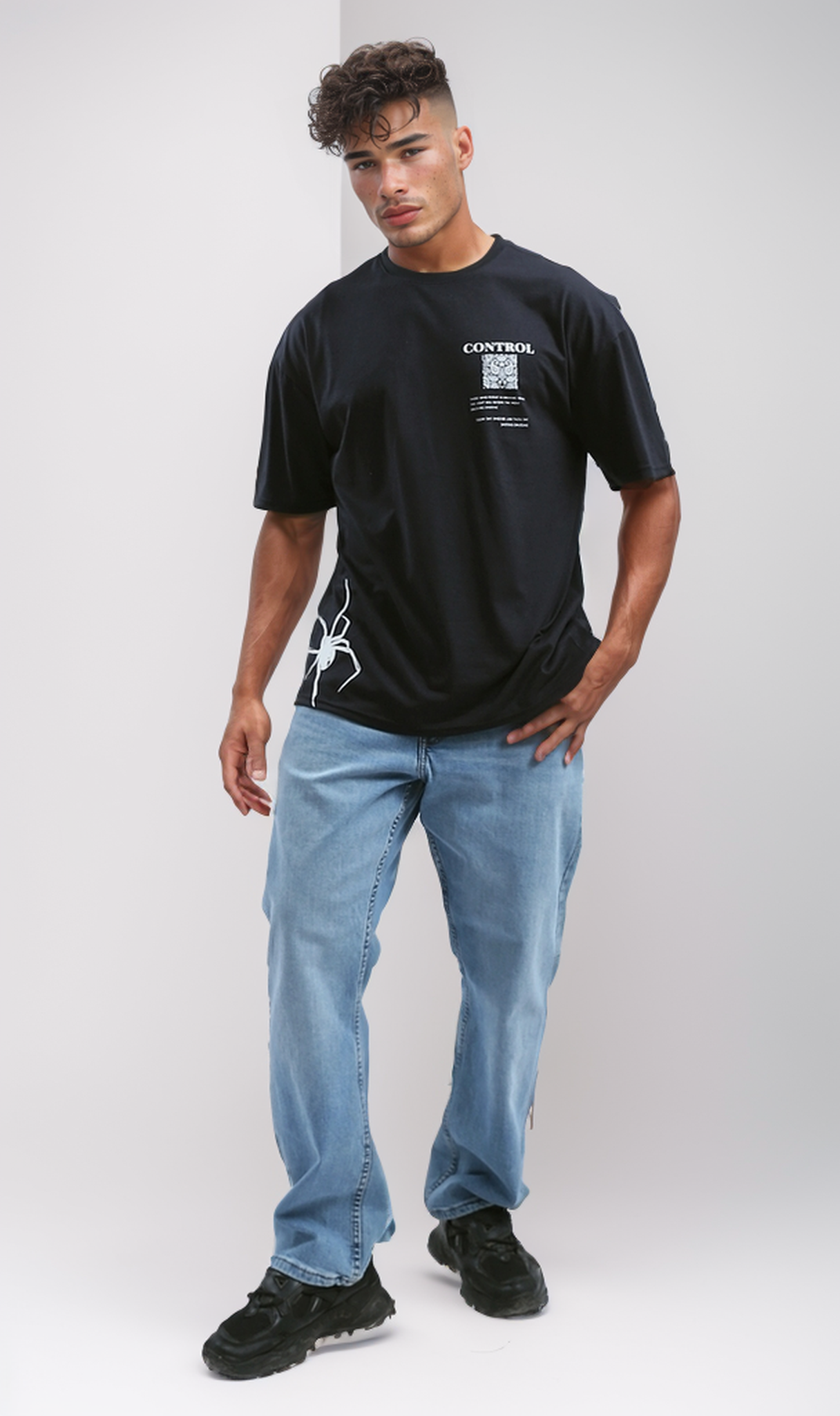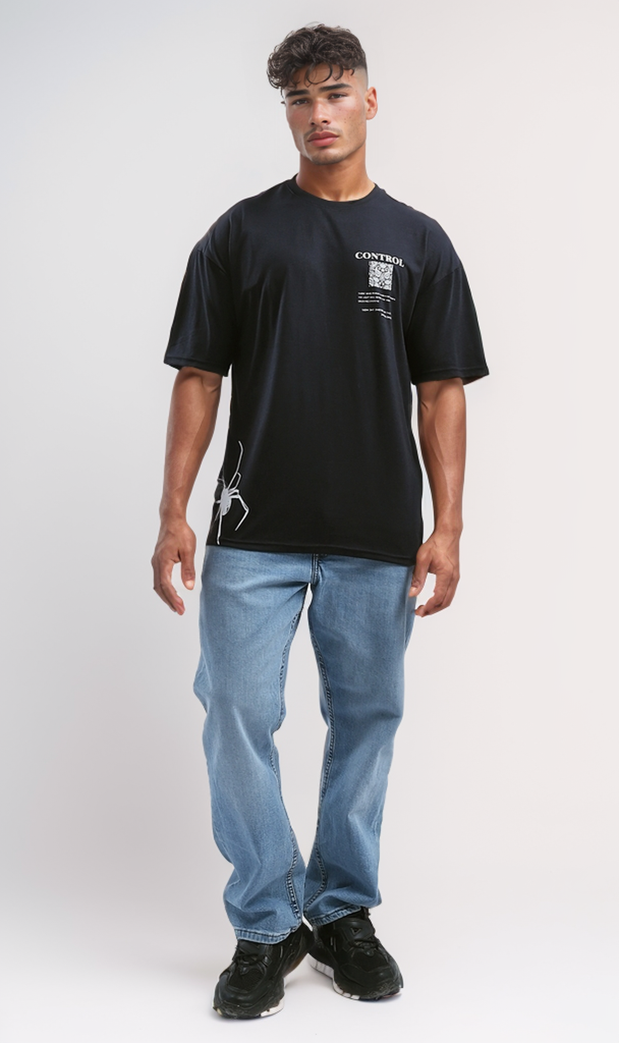 O190163 Printed "Control" Slip On Summer Tee - Black