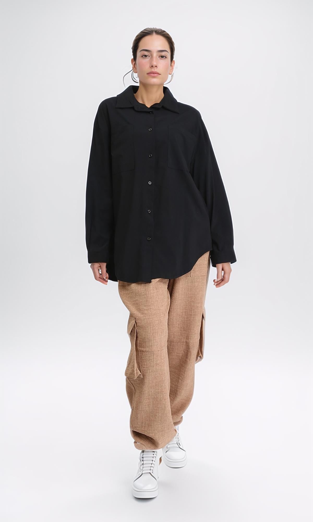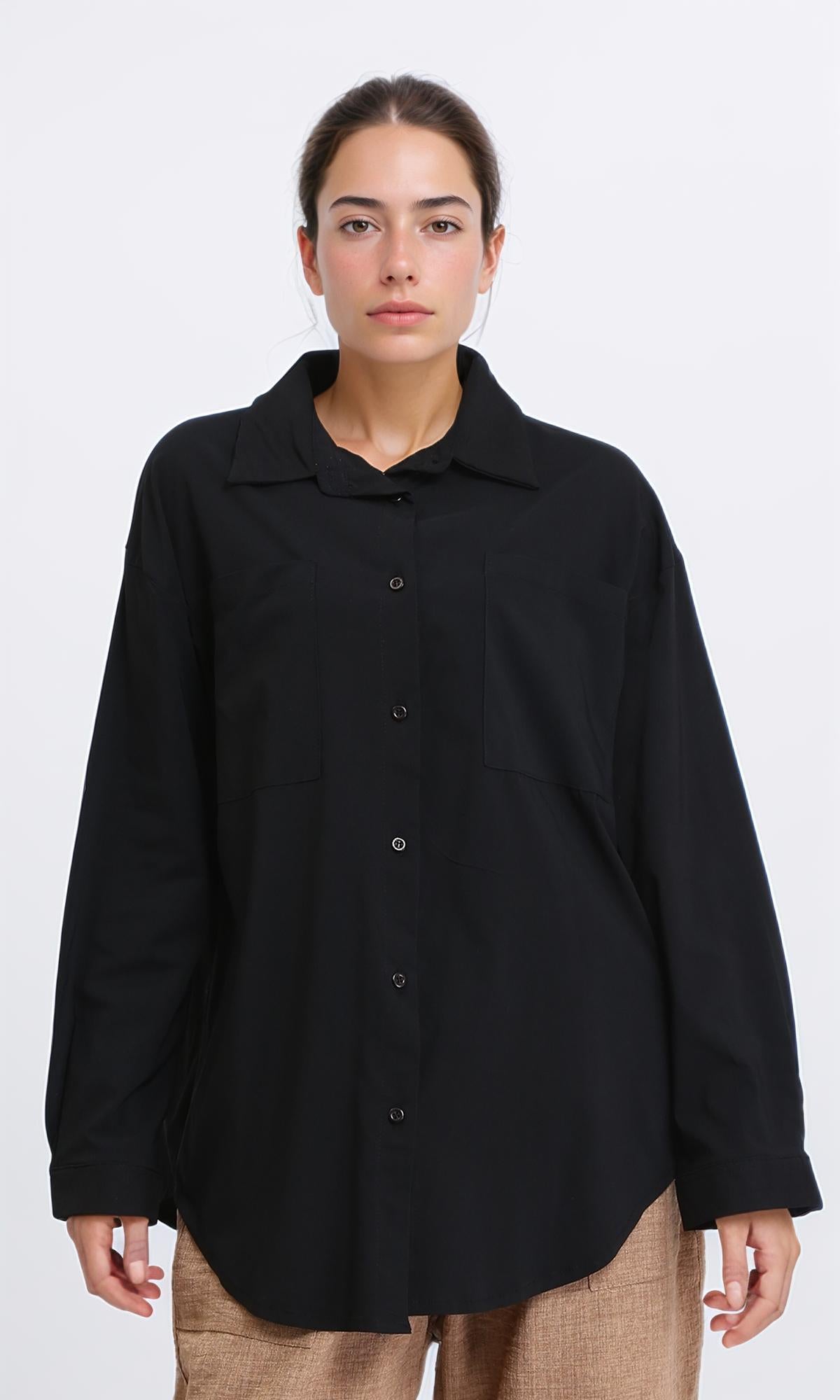 R206084 - Solid High-Low Shirt with Front Pocket - Black
