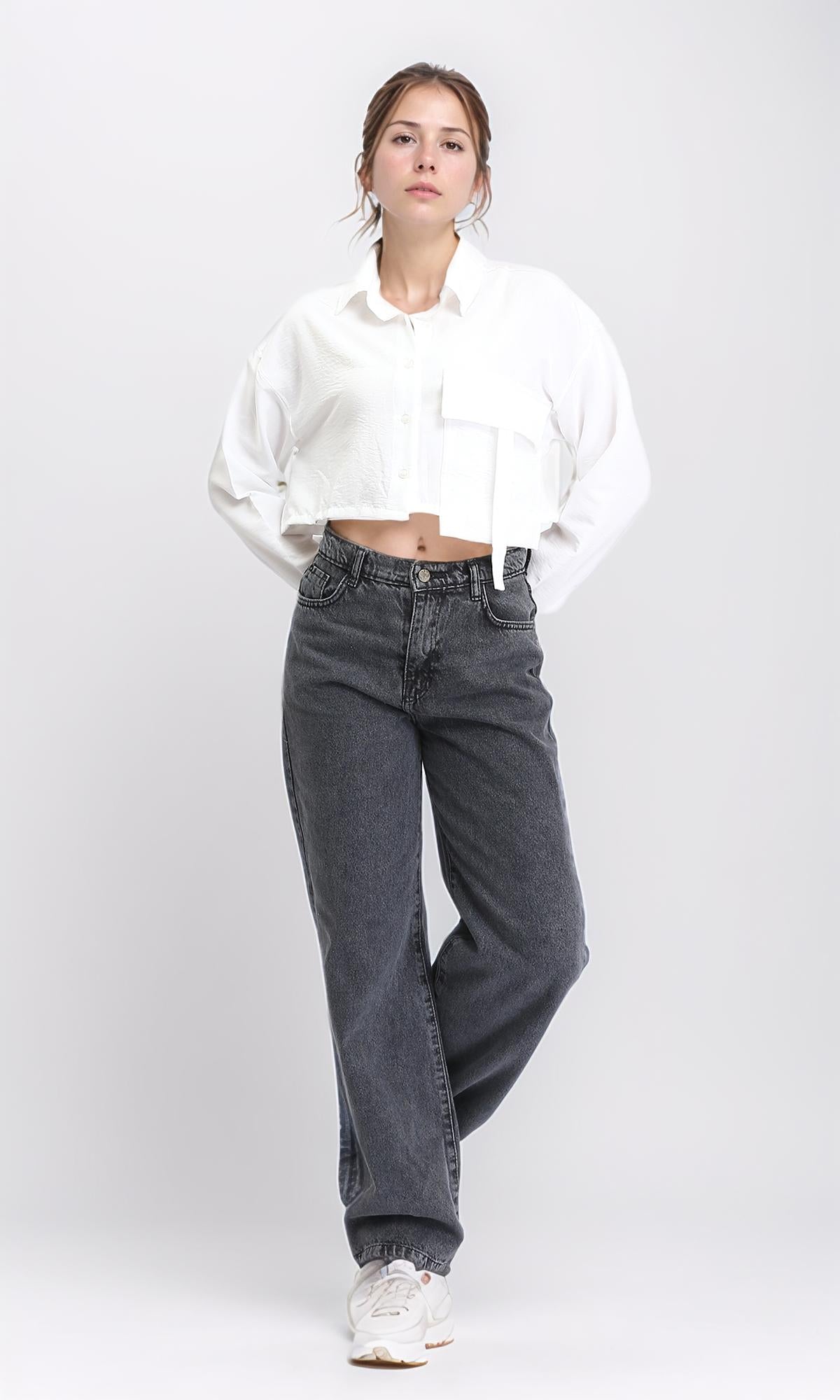 R208489 - Solid Cropped Shirt with Front Pocket - White